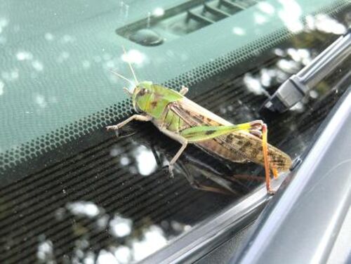 今朝、家から車を発進させると、 ワイパーのところに変なものが・・・? 何だろうとしげしげ見たら・・・・オオゥ!!トノサマバッタ。 体長8センチ以上。 威厳のある、精悍な顔つき。 今時、こんな大きな殿様にお目にかかったことがないので、へへ~と平伏…