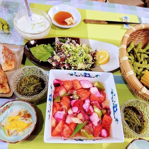 晩ごはんとりどりの夏野菜と酢だこのマリネ。サッパリした味わいです。カツオのたたき・だだちゃ豆・とうもろこし・もずく酢・ビシソワーズ・赤魚の西京味噌焼き。 日曜の俳句大会、ぐったりしました。雨上がりのあとの蒸し暑さはハンパない。外での仕事を…