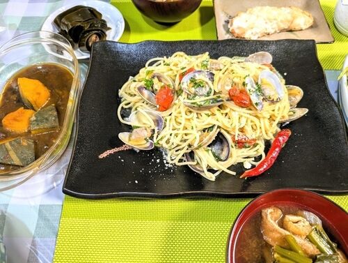 ボンゴレビアンコ北海道のアサリで作りました。粒が大きくて滋味深いボンゴレビアンコ。 ニンニクは田子町の「福地ホワイト六片種」。あまりにも有名になりすぎて県産品なのに入手困難になっています。香りも味も全く違います。 チキンは父に無理。固くて歯…