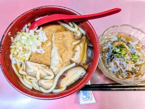 🔷 ちからうどん朝は天気が良かったのですが、徐々に雨💦 市内の取材先から戻り、父のランチを支度しました。以前から仕込んでおいたお揚げさんに餅を詰めたものを入れて、力うどんを作りました。こういう肌寒い日は、身体があったまります。春雨ともずく酢和え…