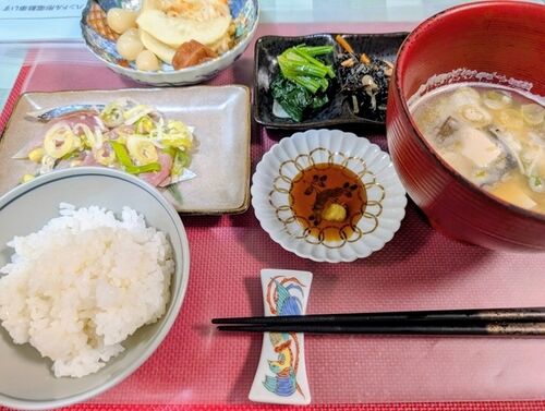 🔶 今日はとても寒い!風邪をひいている人が多いです。急に冷え込んで雪も積もってきました。朝ごはんは、納豆汁、鰺のたたき、ほうれん草のお浸し、ひじき煮、漬物 昼ごはんは、天ぷらうどん。カレイの煮つけ、かぼちゃ煮、ブロッコリ、漬物うどんひと玉だと…