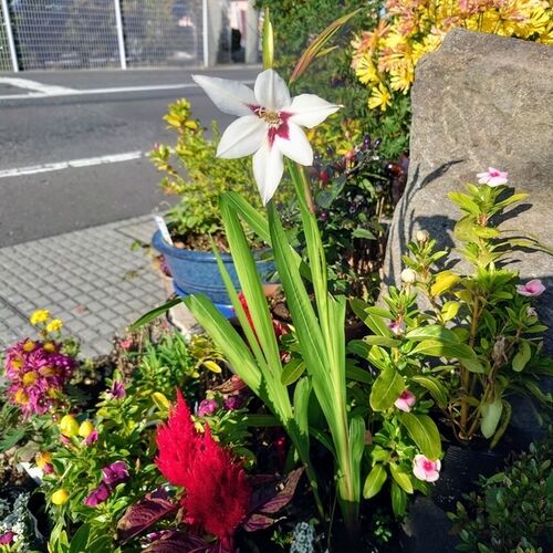 11月になるのに、開花したお花が! 夜の外気温が6℃なのに。 アシダンセラは、アヤメ科の植物で、アヤメのようなたたずまいがあります。 花は白く、中央部分はチョコレートのような茶色をしているのが特徴で、花径が10cmほどある大きな花です。 花びらは6枚…