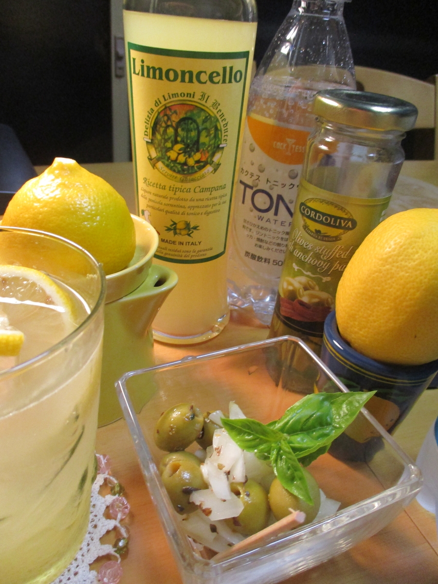 今夜は、レモンチェッロ(カクテル)とグリーンオリーブのおつまみを