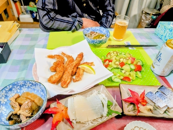 あらかた散ってしまった庭景ですが、紅葉だけはかろうじて樹につながっているのを数枚 お皿に添えました。父はごきげんです。