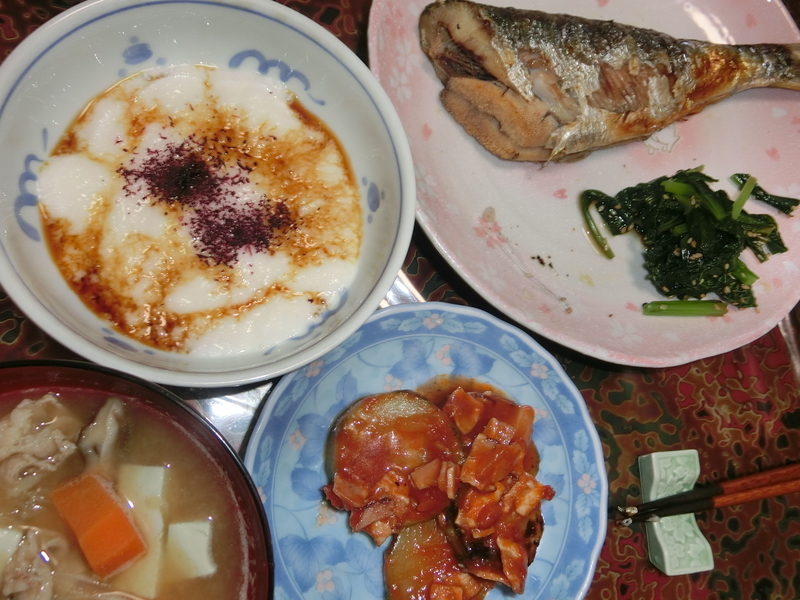 ニシンの塩焼き、小松菜ゴマ浸し、とろろ(紫蘇かけ)、豚汁、ズッキーニとベーコンのトマト煮